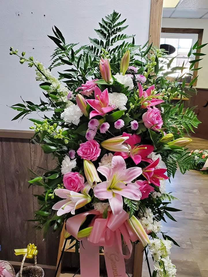 This Standing Spray is the perfect way to honor your loved one with a beautiful display of fresh seasonal flowers and lush greenery. Personalize it with ribbons, names, and decorative elements like butterflies and birds. Customization options allow you to create a unique and meaningful tribute.